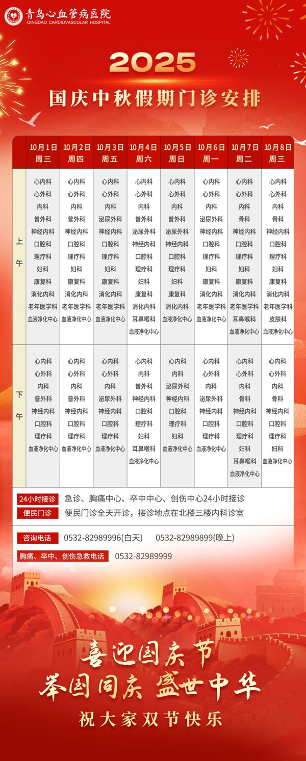 @版权所有 青岛心血管病医院 办公室 E-mail:qdxxgbyy@126.com 地址:青岛市市北区南京路201号 邮编:266034 电话:(0532)82989996 传真:(0532)85722867 乘车路线:12、211、309、308、307、210、370路青岛阜外医院站;地铁3号线敦化路站(B出入口) 信息产业部备案号:鲁ICP备08011074号-2 青岛市公安局网站备案号:37020020071605