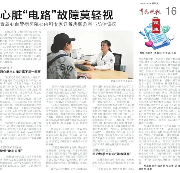 心慌、乏力、心跳时快时慢甚至“乱七八糟”?这可能是心脏的“电路系统”在向你的身体发出警报。心房颤动(简称房颤)作为一种常见且危害严重的心律失常,因其症状的隐匿性和公众认知不足,常常被大家忽视,直至引发脑卒中、心衰等严重并发症才追悔莫及。日前,记者专访了青岛心血管病医院心内科副主任兼16病区主任、主任医师常瑜,为我们揭开心律失常与房颤的神秘面纱,厘清常见误区,守护心脏健康。